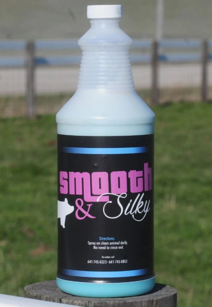 Smooth & Silky is a daily + show day spray for use with swine. Is also an amazing moisturizer for cattle as we use it in our barn in the winter. Put in a spray bottle and spray on. No need to rinse out.