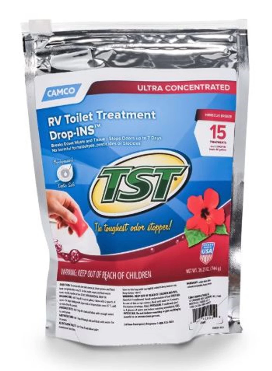 The TST Hibiscus Breeze Drop-Ins help control unwanted odors and break down waste and tissue in your black water holding tank. The easy to use drop-ins contain a special chemical that helps break down waste, and a blend of tropical-scented surfactant oils that trap unwanted odors in your tank, making your camping experience more enjoyable. The drop-ins are RV and marine approved, non-formaldehyde and safe for all septic tanksโtheyโre even great for portable camping toilets! Each container comes with 15 drop-ins.