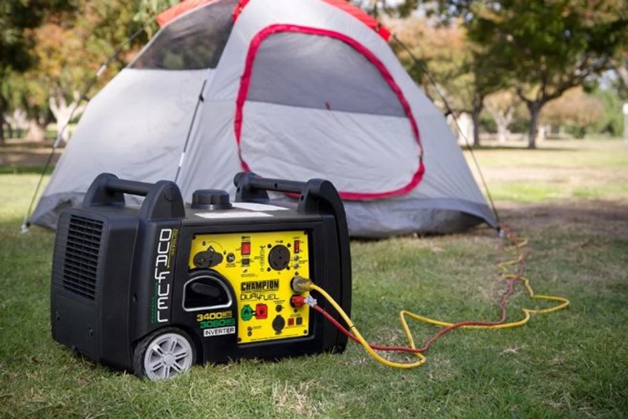 The Champion Power Equipment 100263 3400 Watt Portable Inverter Generator is the perfect combination of versatility and convenience whether you need power for your home, RV or project. The convenient electric start includes a battery, plus Cold Start Technology ensures a quick start in cold weather. Designed for safety with a low oil shut-off sensor, this inverter has a 0.6-quart oil capacity (10W-30). Operate your Dual-Fuel generator right out of the box on gasoline or propane. Using gasoline, the 192cc Champion engine produces 3400 starting Watt and 3100 running Watt, and will run for 7.5 hours at 25% load. It produces 3060 starting Watt and 2790 running Watt, and will run for 14.5 hours at 25% load when using a 20-pound propane tank. Included are a 120V 30A RV (TT-30R), two 120V 20A household outlets (5-20R), a 12V DC automotive-style outlet with dual USB adapter, plus a propane hose with a built-in regulator. Operates at 59 dBA from 23 ft. – about the same noise level as normal conversation. The optional Parallel Kit provides a quick clip-on connection which allows you to increase output by connecting up to two 2800 Watt or higher inverters. Also included is a standard 50-Amp RV outlet with power to start and run two 15,000 BTU RV air conditioners. Champion Support and our nationwide network of service centers will back up your purchase with a 3-year limited warranty and free lifetime technical support.