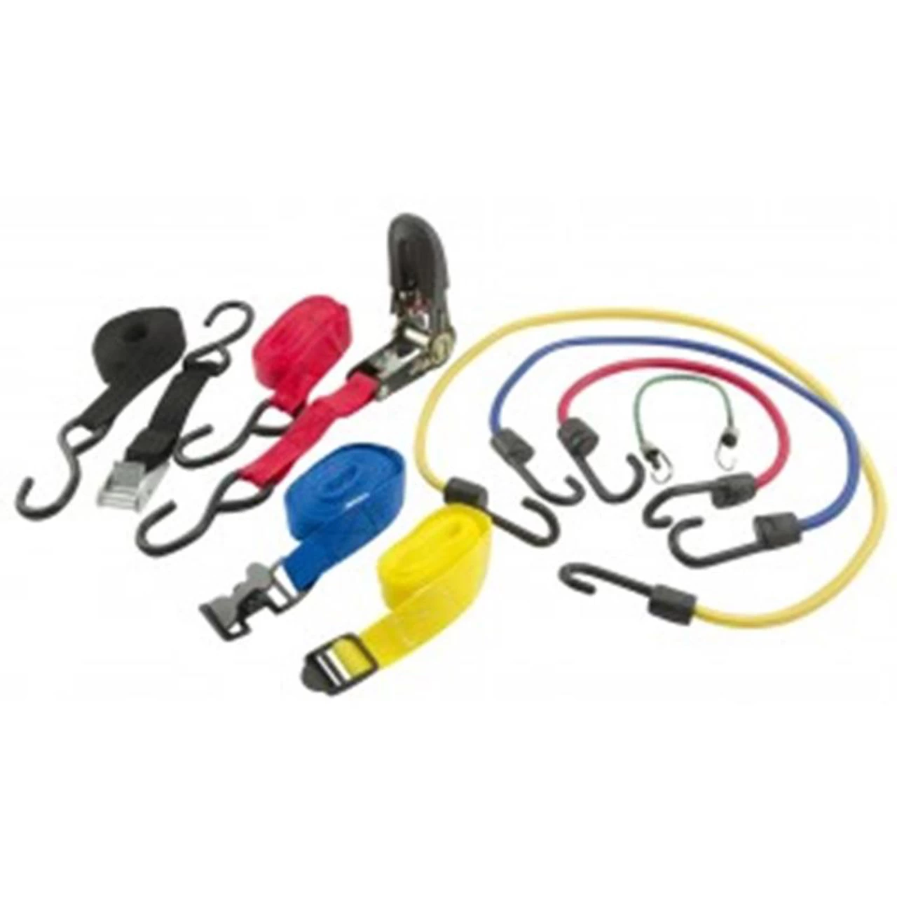 Erickson Manufacturing has been producing tie-down straps and related products for over 25 years. As a manufacturer of tie-down and towing products in North America, Erickson Manufacturing strives to provide the safest products with the consumer in mind. (2) 1 inch x 15 inch 500 lb.Rubber Handle Ratchet Straps (1) 1 inch x 10 inch 300 lb. Cam Strap (1) 1 inch x 10 inch Utility Strap (2) 1 inch x 6 inch Handy Straps Deluxe Bungey Cords 2 ea. 18 inch, 24 inch, 36 inch (4) Mini Bungey Cords