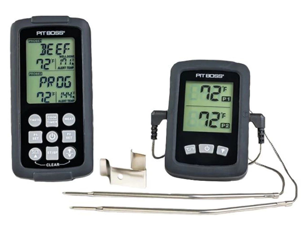 Grill with confidence with the Pit Boss Wireless Digital Meat Thermometer. Using the fully programmable meat probes, thereâ€s no need to step away to check on your food since you can monitor it from up to 300 feet away. Simply set your desired temperature for whatâ€s on the menu for the day and rely on the bright LCD screen to let you know when itâ€s ready. The thermometer also has an alarm to alert you when the desired internal temperature is reached and features a countdown timer.