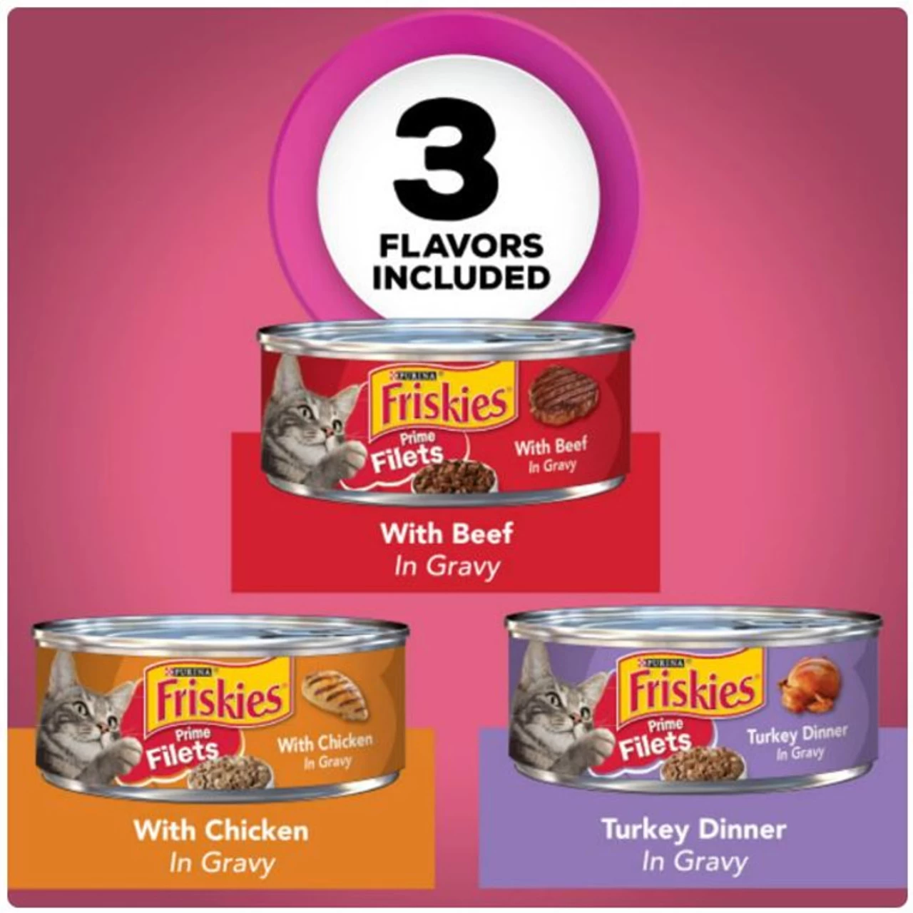 Purina Friskies Meaty Favorites Wet Cat Food Variety Pack, Let your cat choose from her favorite entrees at mealtime with this Purina Friskies Prime Filets Meaty Favorites wet cat food variety pack. Three different recipes bring the tastes of real beef, chicken or turkey to her dish, giving her more of the tastes she loves. Each recipe features a savory gravy for added yum in every bite, and the tender chunks of meat and poultry give this collection the textures cats crave. Open a different can at each feeding, and let the tempting aroma lead her to her dish. Real poultry or fish in every recipe 2Real beef, chicken or turkey for the tastes cats love Tender chunks provide a tempting texture Contains three different recipes for added variety in your cat’s diet 100 percent complete and balanced nutrition for adult cats Provides essential vitamins and minerals to help support overall health