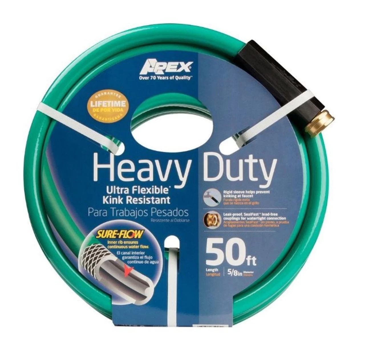 The Heavy Duty ultra flexible kink resistant garden hose is an ideal hose for serious gardeners. This hose is flexible, easy to maneuver and resists kinks. This hose has maximum reinforcement for durability and abrasion resistance. Sure-flow system provides continuous water flow. Rigid sleeve stops kinking at the faucet. Crush-resistant coupling up to 550 lb. Made in the USA.