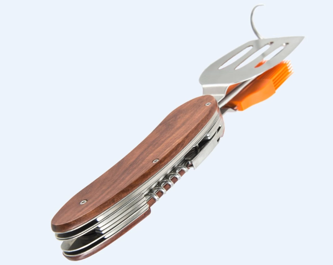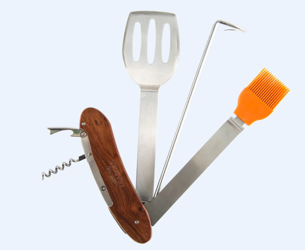 - Includes portable-sized spatula, pig tail, basting brush, and corkscrew