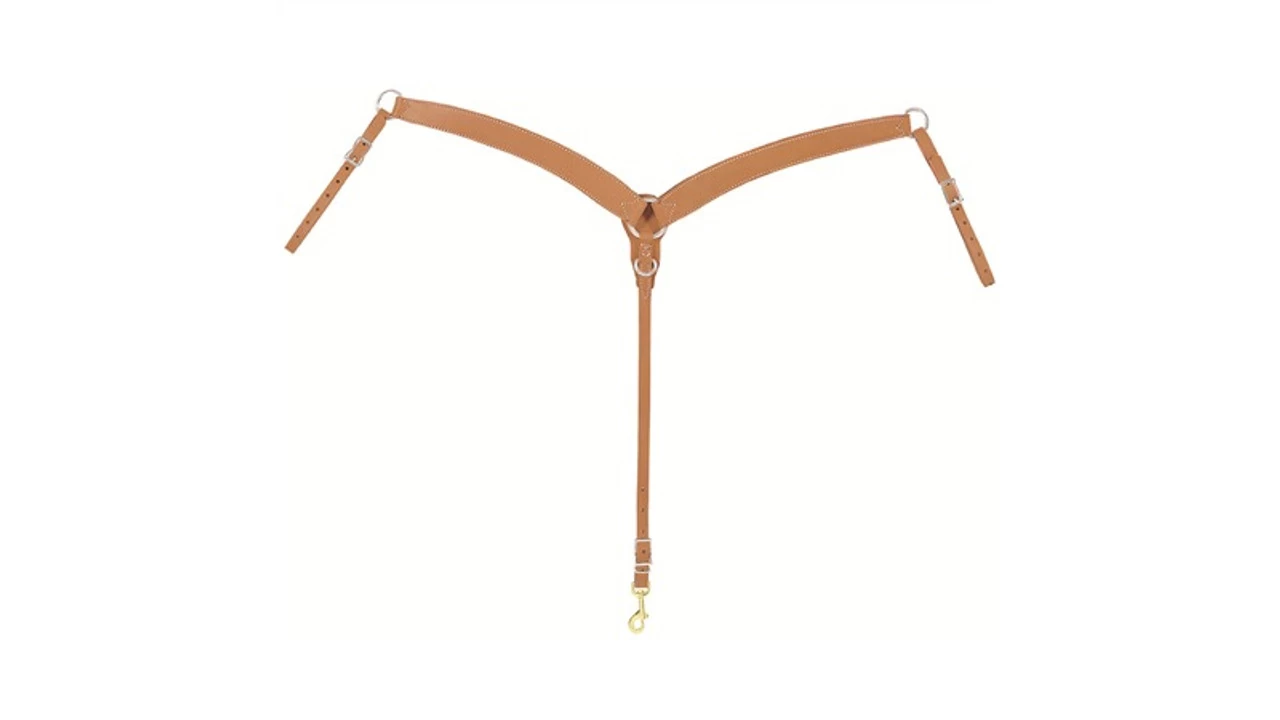 The Horizons Collection features great basic tack perfect for everyday riding. This durable, weather-resistant harness leather breast collar features doubled and stitched breast pieces, a center ring with leather backer, an adjustable center strap.