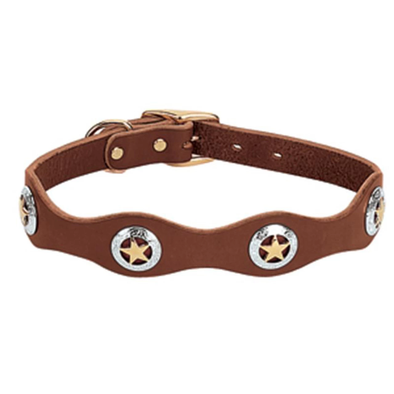 Crafted from beautiful, weather-resistant harness leather, this scalloped collar is accented with Texas star conchos for an eye-catching look. Nickel plated over zinc die cast conchos are highlighted by an 18 karat gold plated star.