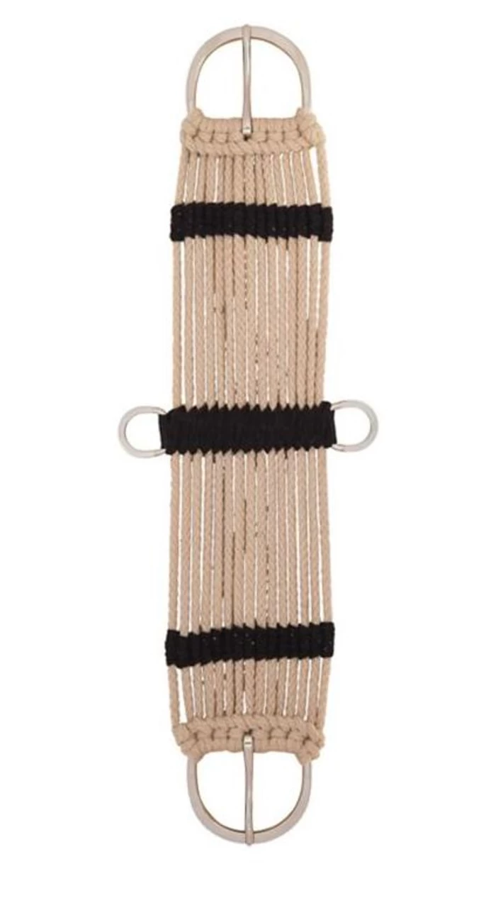 This rayon cinch is a traditional favorite great for all riding needs. Features woven-in dees for tie down strap and back cinch attachment. Durable nickel plated hardware. White with brown accents. Horse size.